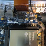 4. 固定ネジ4つと小さなコネクタを外すとディスクユニット部分を外すことができるようになる。外し方としてはディスクユニット部分を垂直に少しだけ持ち上げてマザーボード部分と外すような感じ。細い線がたくさんあるので細心の注意が必要。