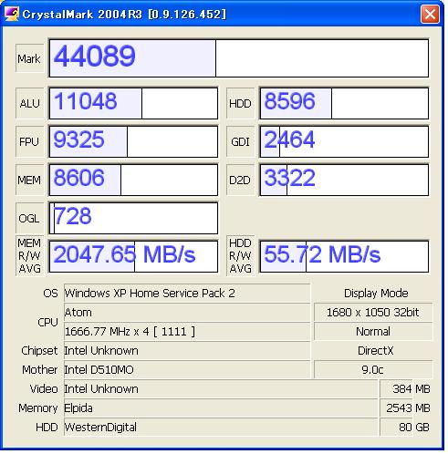 Intel D510MO という次世代Atomプロセッサが搭載されたマザーボードをcrystalmarkというソフトでベンチマークを計測。