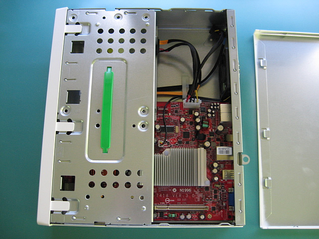 ハードディスクを取り付けるためにドライブ格納部分のパーツを取り外す。筐体の中をざっと確認したところ、拡張性は皆無・・・とはこれは言わないか。むしろnettopにしては頑張っていると言えるか。取り付けることができるハードディスクは1台、メモリも1枚まで、拡張カード類を差し込むソケットなどは無い。他にCFカードスロットとMini PCI Expressスロットらしきものがある(無線lanやドライブ認識されるかなど試してみたいが、今回はパス)。cpuはIntel Atomが装着されているらしいが、おそらく銀色の放熱フィンの下にでもあるのではないだろうか。(未確認)